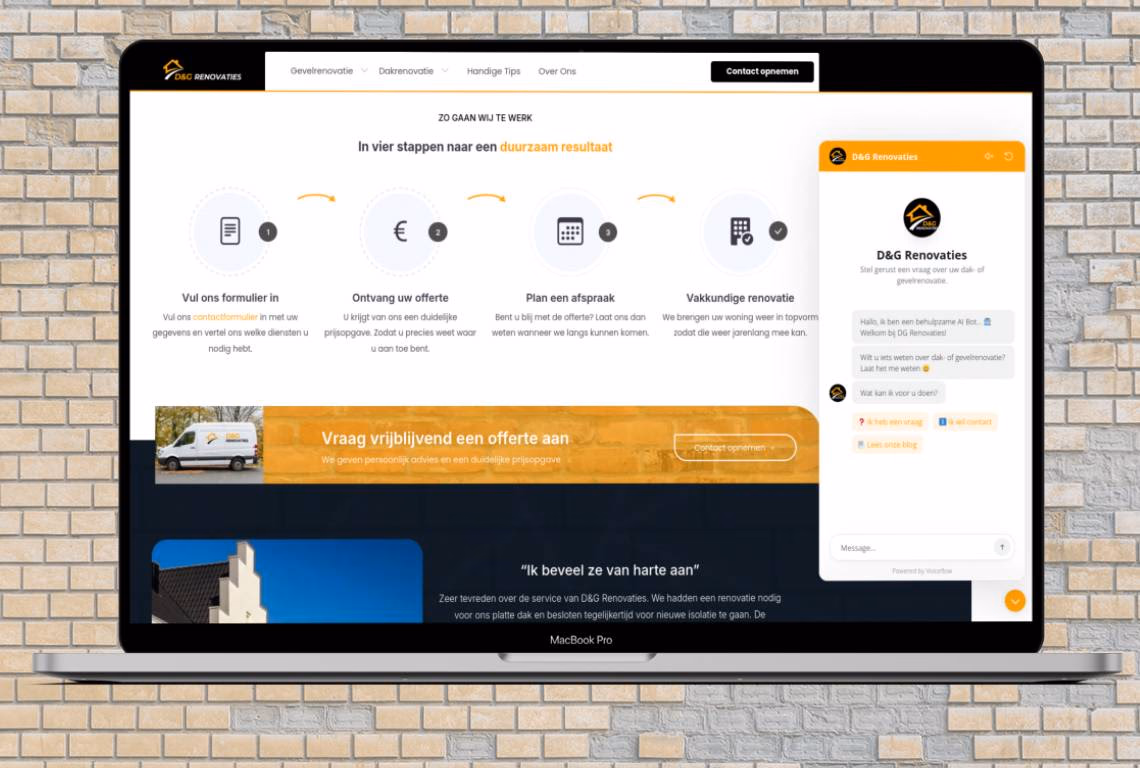 DG Renovaties sought a powerful online presence to showcase their high-quality facade and roofing renovation services. We delivered a custom website designed for lead generation, optimized for performance and SEO, ntegrated with a custom AI chatbot for scalable customer service, and directly integrated with their CRM. Beyond the website, we implemented a targeted digital strategy to increase their local visibility and attract new clients.